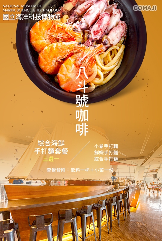 超人氣產品【國立海洋科技博物館-八斗號咖啡】提供鮮味十足的海鮮手打麵套餐,絕對是享受八斗子在地美食及欣賞漁港夜景的最佳場所!